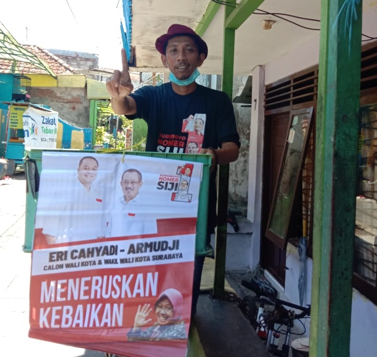 Selain mengajak, lanjut Jarwo, untuk mendukung protokol kesehatan di tengah pandemi Covid-19, dirinya juga akan membagi-bagikan masker yang bergambar pasangan Eri Cahyadi-Armuji kepada orang-orang yang ditemuinya saat berjualan keliling.