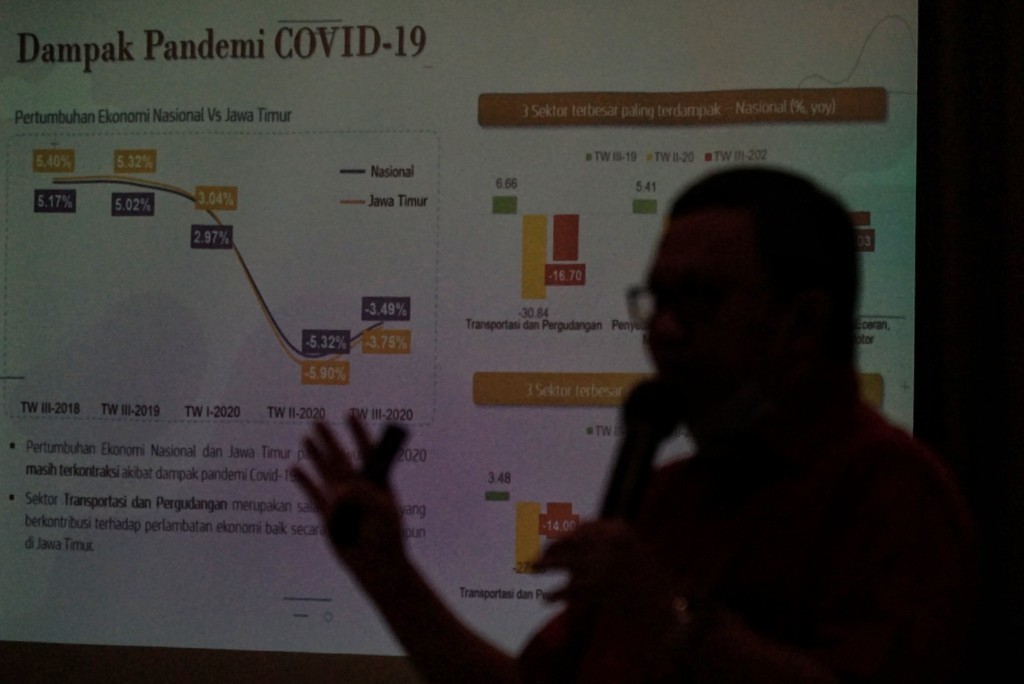 (kiri, kanan) Moh Eka Gonda Sukmana, Deputi Direktur Pengawasan Lembaga Jasa Keuangan 4 dan Perizinan, Bambang Mukti Riyadi, Kepala OJK Regional 4 Jawa Timur, Budi Susetiyo, Deputi Direktur Pengawasan Lembaga Jasa Keuangan 1 memaparkan upaya Pemulihan Ekonomi Nasional (PEN) dengan sinergi pemerintah saat digelarnya gethring di Surabaya, Jawa Timur, Senin (23/11/2020). Otoritas Jasa Keuangan (OJK) regional 4 Jatim dan Bank Indonesia (BI) terus melakukan upaya untuk memulihkan perekonomian nasional termasuk wilayah Jatim. SP/Julian