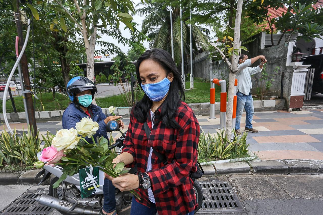 Puluhan gadis milenial membagi setangkai mawar bertuliskan "Bela Bu Risma, Selamatkan Surabaya” kepada pengendara di tiga titik traffic light (TL), yakni kawasan Jalan Mayjen Sungkono, Jalan Darmo, dan Jalan Kertajaya, pada Senin (30/11/3/20).