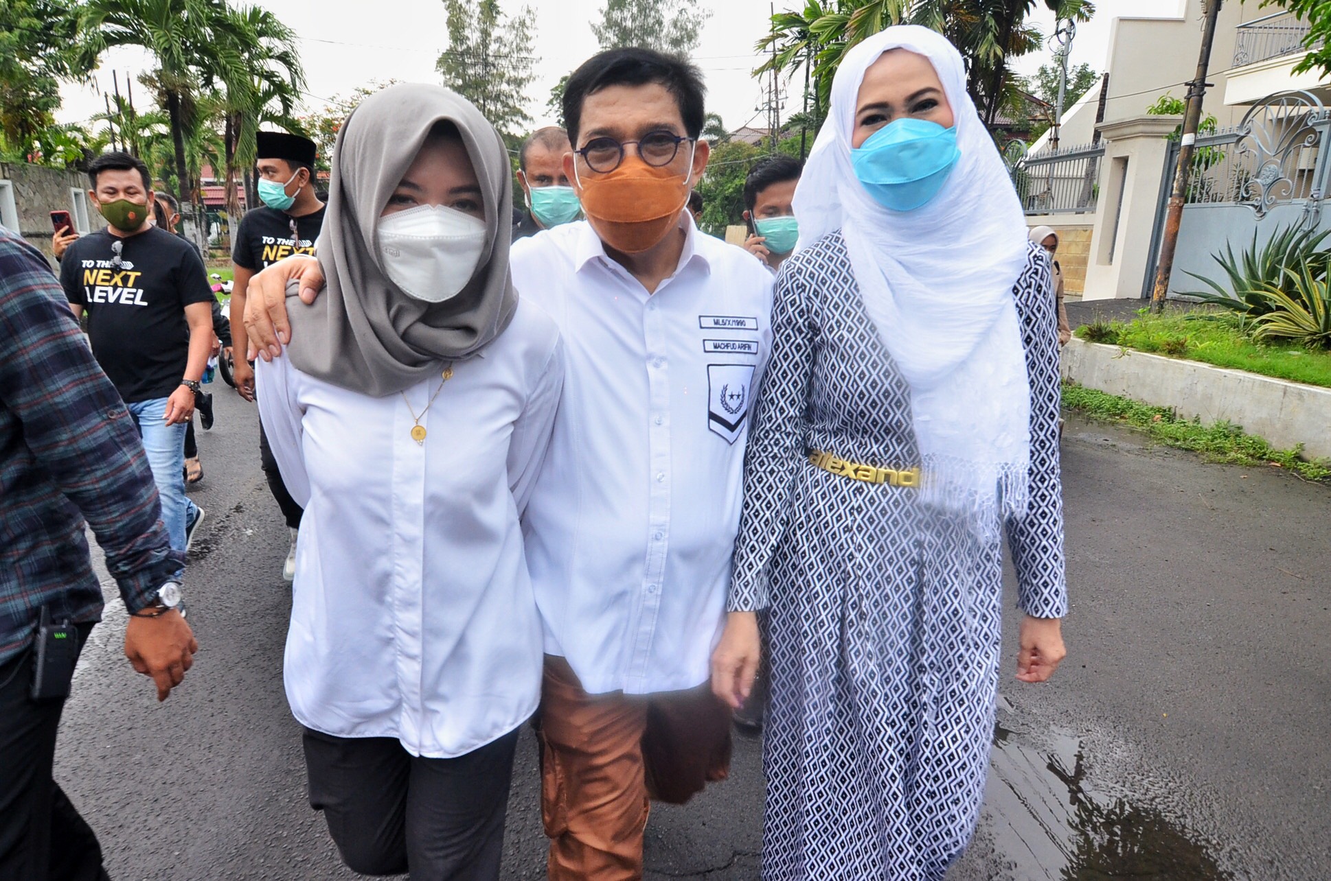 Machfud Arifin dan istrinya berjalan kaki dari kediamannya menuju TPS 25 Jalan WR Supratman, Tegalsari, Surabaya. Keduanya tampak memakai baju putih dengan memakai masker.