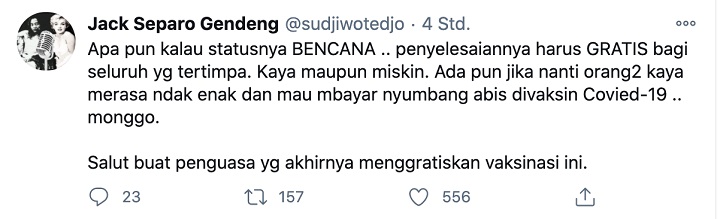 Tak hanya itu, Sudjiwo Tedjo juga memberikan apresiasi atas kebijakan pemerintah yang mengratiskan vaksin Covid-19. “Apa pun kalau statusnya BENCANA .. penyelesaiannya harus GRATIS bagi seluruh yg tertimpa. Kaya maupun miskin. Ada pun jika nanti orang2 kaya merasa ndak enak dan mau mbayar nyumbang abis divaksin Covied-19 .. monggo. Salut buat penguasa yg akhirnya menggratiskan vaksinasi ini,” ungkapnya. n erc/rmc