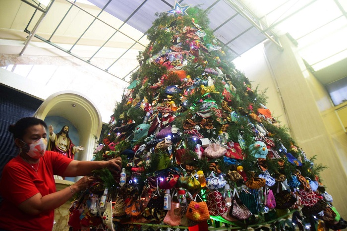 Pohon Natal tersebut dihias menggunakan masker, hand sanitizer, dan sabun cuci tangan yang di gantungan mengelilingi pohon.
