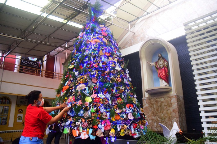 Pohon Natal berdiameter 1,8 m dengan tinggi 3,4 m dengan dihiasi sebanyak 1.000 masker, 500 handsanitizer, dan 300 sabun cuci tangan.