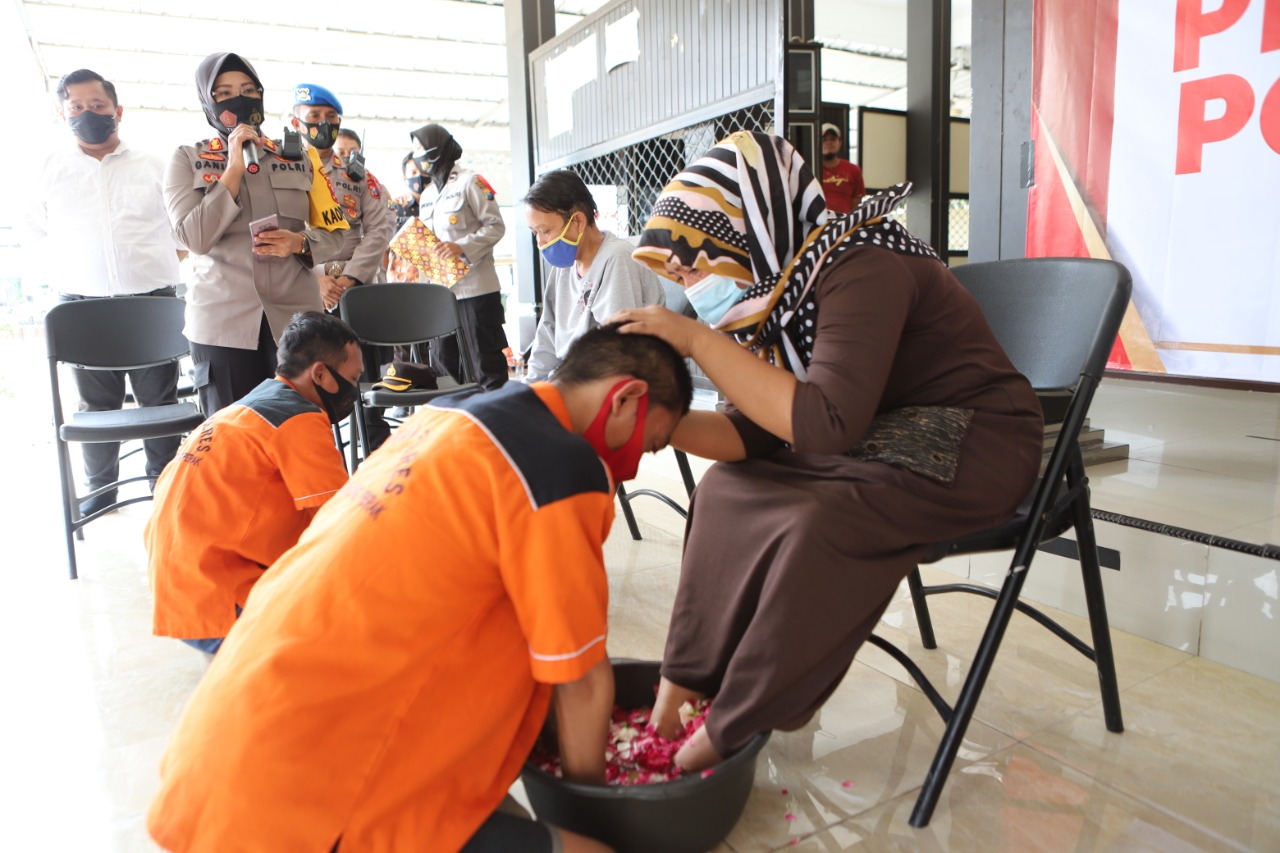 "Kegiatan kita hari ini ialah membasuh kaki ibu dari para tersangka kami di Rutan Polres Pelabuhan Tanjung Perak. Tujuan dari kegiatan ini adalah bagaimana nantinya dari lubuk hati yang terdalam mereka bisa berbakti kepada orang tua dan berguna untuk nusa dan bangsa," ucap Kapolres Pelabuhan Tanjung Perak.