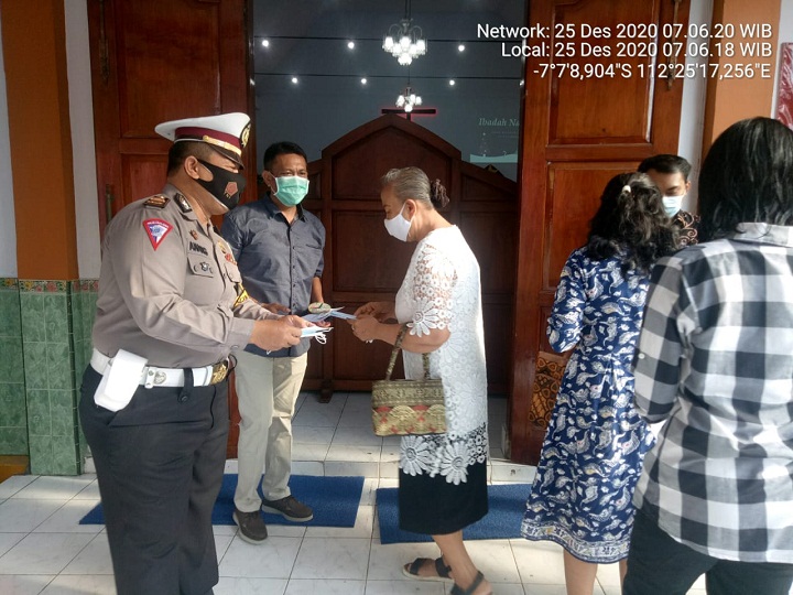 Korps baju coklat yang mempunyai tugas dan fungsi salah satunya mengatur lalu lintas ini, Jum'at (25/12/2020) memberikan masker gratis ke sejumlah jamaah gereja yang ada di wilayah Lamongan.