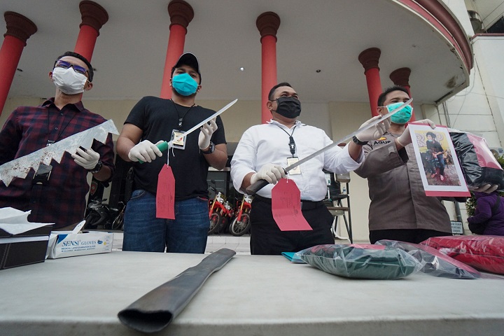 SURABAYAPAGI.COM, Surabaya – Tak terlihat rasa ketakutan dan bersalah yang dialami sembilan bocah rerata usia 14-15 tahun ini. Mereka hanya terdiam, tertunduk, terkadang menengok sorotan kamera. Hanya saja, mereka dikenakan topeng. Meski masih bocah, aksi mereka sungguh kejam. Padahal tatapannya masih terlihat polos. Tetapi, mereka menyimpan sebilah samurai, gergaji dan beberapa benda tajam lainnya. Berikut laporan wartawan Surabaya Pagi Mahbub Fikri dari Polrestabes Surabaya.