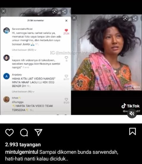 Di akun ABG itu, video hinaan Sarwendah sudah dihapus. Tapi ia menjadi bulan-bulanan netizen di unggahan-unggahan video TikToknya. Ada lebih dari 2.000 lebih komentar yang menjadikannya sasaran tembak netizen.