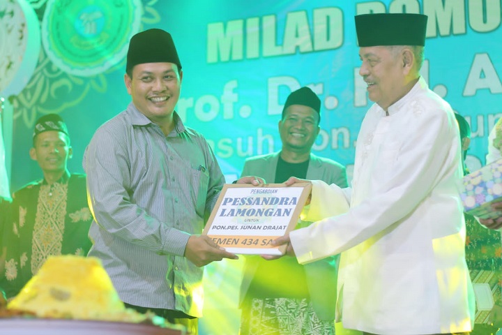 SURABAYAPAGI.COM, Lamongan - Momen ulang tahun KH. Abd Ghofur pengasuh Pondok Pesantren Sunan Drajat Paciran Lamongan, Pada Jum'at (12/2/2021) dirayakan cukup spesial oleh Santri dan Alumni Sunan Drajat (Pessandra), salah satunya dengan memberikan surprise kado ribuan semen untuk kelangsungan pembangunan pondok.