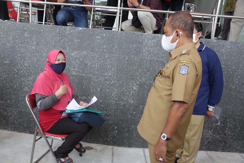 Dengan memakai baju dinas cokelat, Cak Ji - sapaan lekatnya, tiba di RSUD Soewandhie sekitar pukul 12.00. Di sana, ia langsung memantau proses tahapan vaksinasi, mulai dari meja pendaftaran, meja skrining, hingga meja untuk vaksinasi bagi pria.