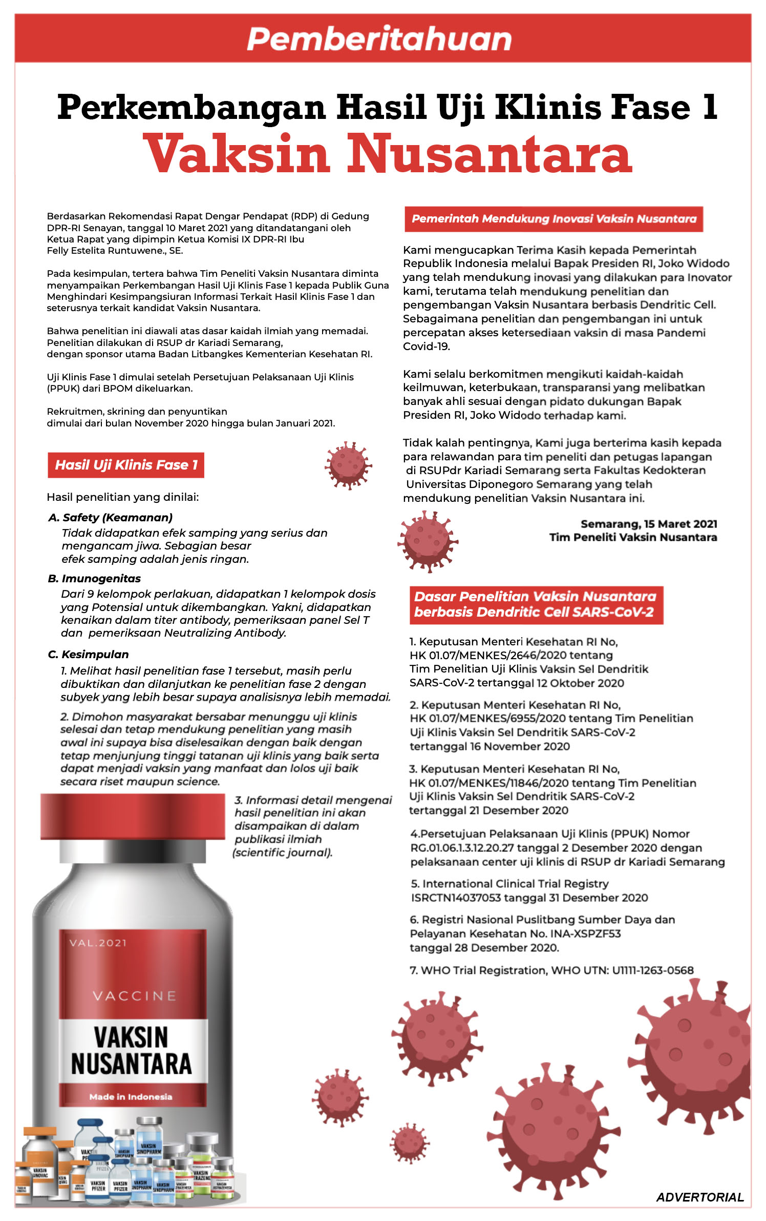 Pada kesimpulan, tertera bahwa Tim Peneliti Vaksin Nusantara diminta menyampaikan Perkembangan Hasil Uji Klinis Fase 1 kepada Publik Guna Menghindari Kesimpangsiuran Informasi Terkait Hasil Klinis Fase 1 dan seterusnya terkait kandidat Vaksin Nusantara.