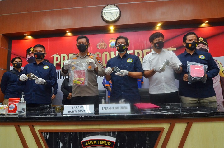 "Kita amankan sabu juga senpi kaliber 38 mm," terang Kabid Humas Polda Jatim didampingi Kasubdit 1 Ditreskoba Polda Jatim Kompol Daniel Somaronasa, Selasa (16/3/2021).