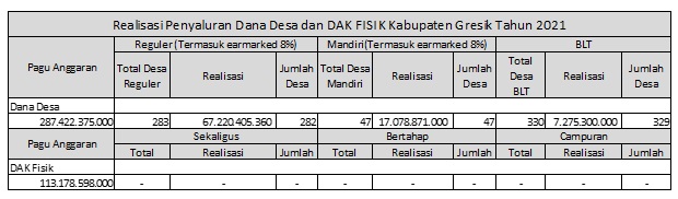 Penyaluran tersebut terdiri dari 282 desa reguler sebesar Rp.67.220.405.360,- dan 47 desa mandiri sebesar Rp.17.078.871.000 (yang didalamnya termasuk earmarked 8�ri pagu anggaran masing-masing desa untuk kegiatan penanganan pandemi COVID-19 antara lain untuk aksi desa aman COVID-19), serta penyaluran BLT Desa KAB. GRESIK Bulan ke-1 untuk 329 Desa sebesar Rp.7.275.300.000,- untuk 24.251 keluarga penerima manfaat (KPM). BLT sendiri disini yang dimaksud adalah BLT Desa yang dilaksanakan selama 12 bulan, dari bulan Januari s.d. Desember 2021 sebesar Rp.300.000,-/perbulan/per KPM dan yang tidak termasuk penerima PKH, Kartu Sembako, Kartu Pra Kerja, Bansos Tunai, dan Program Bansos Pemerintah lain.”
