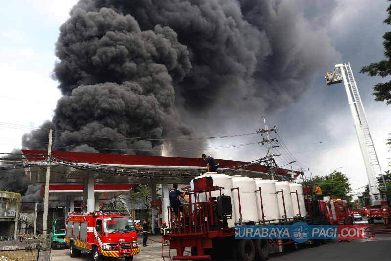Petugas pemadam kebakaran melakukan pembasahan dari kebakaran sebuah pabrik dan gudang plastik di kawasan Margomulyo, Tandes, Surabaya, Jawa Timur, Rabu (31/3/2021). Sebanyak 10 unit mobil PMK tiba di lokasi dan 2 skylift juga berada di lokasi. Sedangkan arus lalu lintas di kawasan Margomulyo menuju Banyu Urip ditutup dua arah. Bahkan jalur Manukan ke arah Margomulyo sementara ditutup. SP/Julian