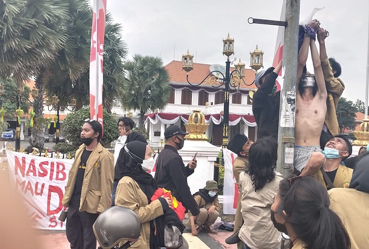 Beberapa di antara mereka membawa spanduk berisi tuntutan mereka. Dalam aksinya para mahasiswa juga melakukan teatrikal. Yakni soal hak mereka untuk menuntut ilmu yang seolah-olah dihilangkan oleh Dinas Kebudayaan dan Pariwisata (Disbudpar) Provinsi Jatim.
