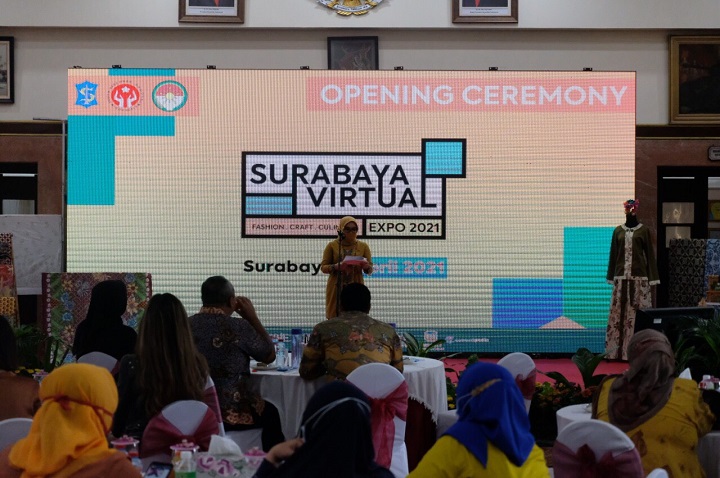 SURABAYAPAGI.COM, Surabaya - Wali Kota Surabaya Eri Cahyadi resmi membuka pameran UMKM virtual pertama di Kota Surabaya. Pembukaan acara yang bertajuk ‘Surabaya Fashion Craft and Culinary Expo 2021’ itu digelar di Lobby Lantai 2 Balai Kota Surabaya, Jumat (9/4).