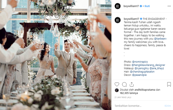 SURABAYAPAGI.com, Jakarta - Presenter Boy William akhirnya mengungkap rencana pernikahan dengan kekasihnya, Karen Vendela Hosea. Boy William berencana melangsungkan pernikahan pada pertengahan tahun 2021 dengan tunangannya, Karen Vandela.