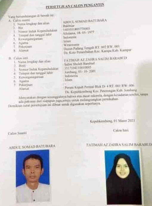 Rencana pernikahan UAS menjadi pembicaraan netizen Jombang karena beredar di salah satu grup media sosial Facebook. Namun pemosting kini telah menghapus foto formulir persetujuan calon pengantin itu.Foto formulir persetujuan calon pengantin Ustaz Abdul Somad (UAS) dengan seorang gadis cantik beredar di media sosial (medsos) Facebook dan menjadi viral sejak Jumat (23/4/2021).