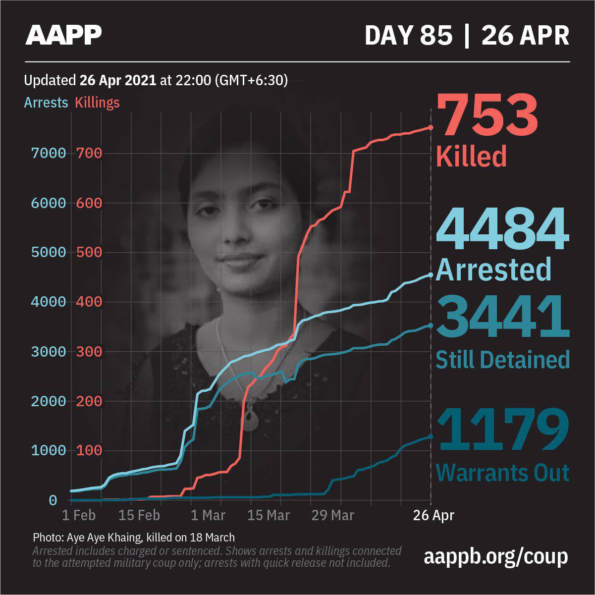 Menurut Kelompok masyarakat sipil pengawas tahanan politik di Myanmar menyampaikan warga yang tewas dalam demonstrasi menentang kudeta militer sudah mencapai 753 orang sejak 1 Februari lalu. Asosiasi Pendamping untuk Tahanan Politik (AAPP) juga melaporkan hingga 26 April, total 4.484 orang telah ditahan.