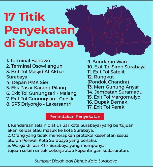 Sedangkan, Pemkot Surabaya akan memberlakukan penyekatan di 17 titik selama larangan mudik. Pada setiap titik penyekatan nanti, para petugas gabungan akan siaga dengan personel total 411 personel.
