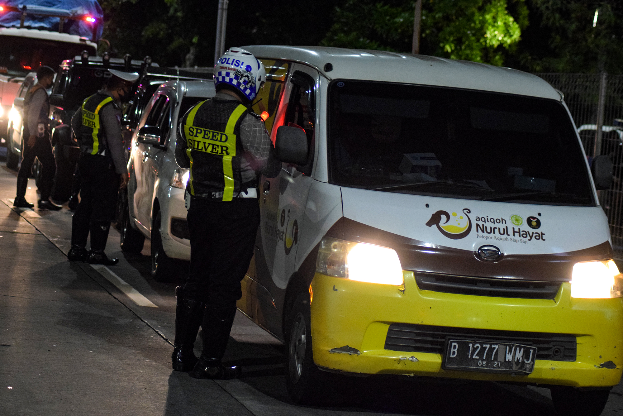 Petugas kepolisian melakukan pemeriksaan kendaraan yang melintas saat penyekatan larangan mudik lebaran 1442 H di pintu masuk Jembatan Suramadu, Kota Surabaya, Jawa Timur, Kamis (6/5). Petugas gabungan yang terdiri dari Polres Pelabuhan Tanjung Perak Surabaya, TNI, Dinas Perhubungan hingga Satpol PP dan Linmas memperketat pemeriksaan bagi pengendara yang menuju ke Madura tidak melengkapi diri dengan Surat Izin Perjalanan Tercetak (SIKM) dan hasil tes cepat antigen atau PCR untuk berbalik arah. Penerapan larangan mudik yang resmi berlaku pada Kamis 6-17 Mei 2021. Terlihat para pemudik turun dari bus yang mereka tumpangi setelah dilakukan pemeriksaan tidak melengkapi surat berpergian. Puluhan pemudik memilih untuk menunggu di pinggir jalan. SP/Patrik Cahyo