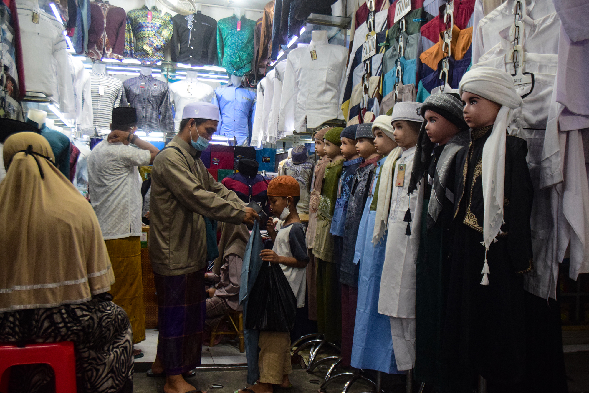 Pelanggan berbelanja baju baru di pusat perbelanjaan di tengah pandemi Covid-19 di Kawasan Wisata Religi Ampel, Kota Surabaya, Jawa Timur, Rabu (13/5). Umat Islam mempersiapkan liburan Idul Fitri yang menandai akhir bulan suci Ramadhan dengan berbelanja baju baru dan barang-barang dekoratif di pasar dan pusat perbelanjaan, untuk menyambut Hari Raya Idul Fitri 1442 H. SP/Patrik Cahyo