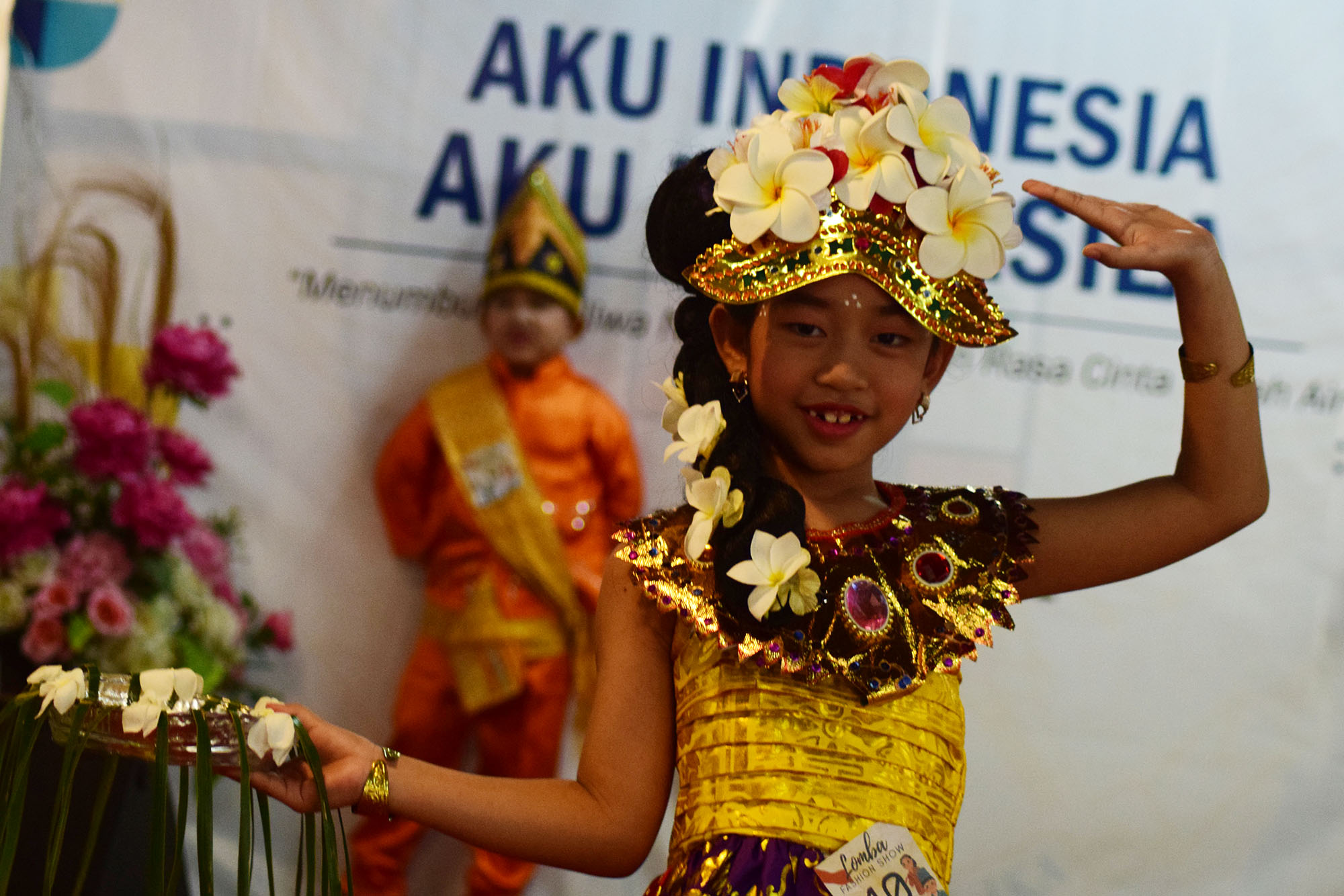 Venezia Valerine Dinda Yuniar, salah satu peserta memperagakan fashion show dengan memakai busana tari bali saat peringatan Hari Kelahiran Pancasila di Surabaya, Jawa Timur, Selasa (1/6). Kegiatannyang digelar Universitas Dr. Soetomo (Unitomo) tersebut mengusung tema "Aku Indonesia, Aku Pancasila dengan tujuan untuk memperkenalkan budaya Indonesia dan meningkatkan rasa nasionalisme anak sebagai pondasi dasar rasa cinta terhadap Indonesia. SP/Patrik Cahyo