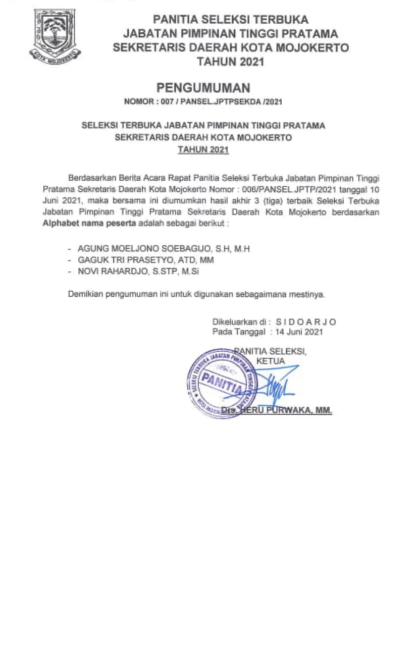 SURABAYAPAGI.com, Mojokerto - Tim Panitia Seleksi (Pansel) Jabatan Pimpinan Tinggi (JPT) Pratama dilingkungan Pemerintah Kota Mojokerto, resmi mengumumkan tiga nama terbaik hasil seleksi pengisian JPT Sekretaris Daerah (Sekda) Kota Mojokerto tahun 2021.