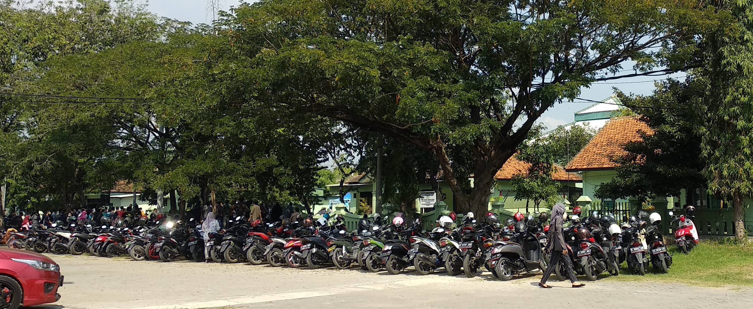 Lahan parkir di Stadion Surajaya Lamongan, dipenuhi kendaraan warga yang ingin mendapatkan vaksin. Antrian satu persatu menunggu giliran masuk diterapkan di tiga pintu masuk dan keluar ke halaman Makodim 0812.