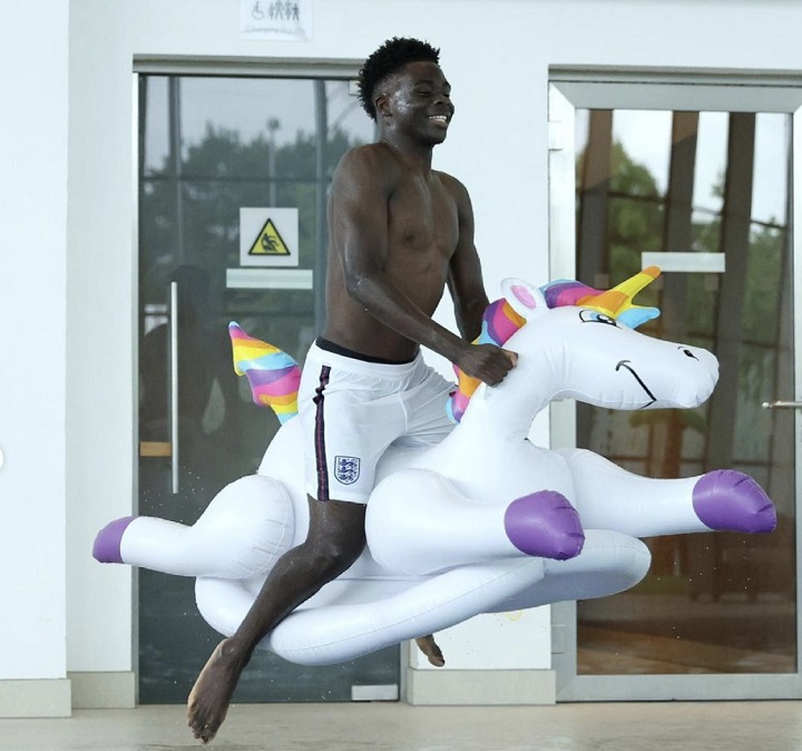 Mulai dari Mason Mount, Bukayo Saka, Declan Rice, hingga Jadon Sancho yang terlihat menikmati Unicorn tersebut di atas kolam renang.