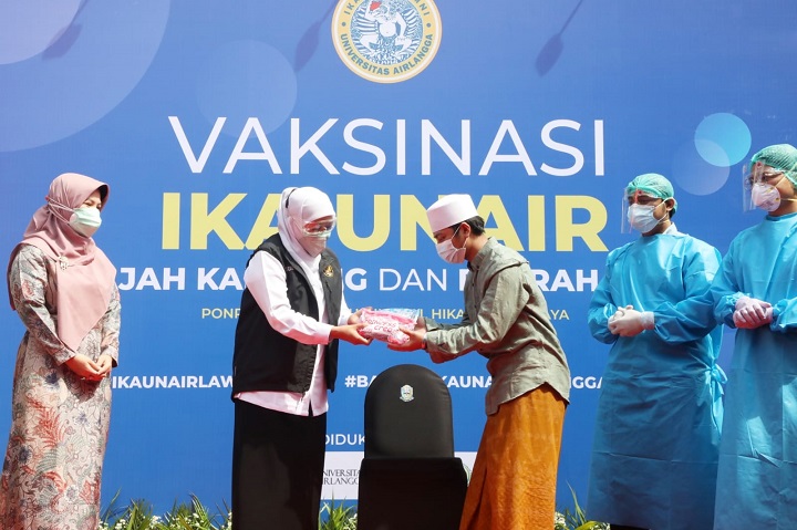 Sementara itu, Untuk mendorong percepatan vaksinasi Covid-19 di tengah-tengah masyarakat, Gubernur Jawa Timur Khofifah Indar Parawansa secara kontinyu memantau langsung kegiatan vaksinasi. Kali ini diselenggarakan oleh Ikatan Alumni (IKA) Universitas Airlangga Surabaya, yang diselenggarakan di Pondok Pesantren Yanabi'ul Ulum Wal Hikam Sidosermo Surabaya, Sabtu (17/7).