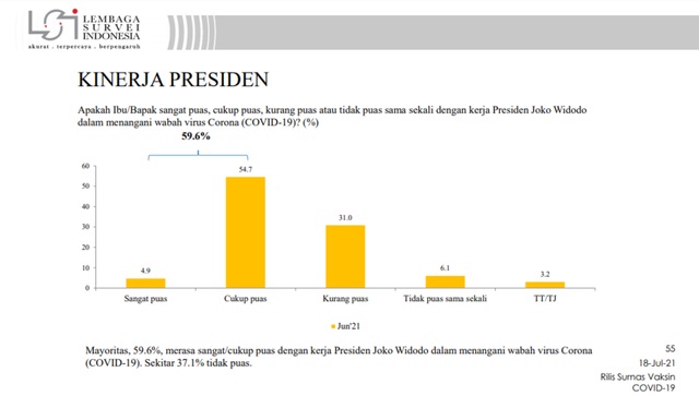 LSI mencatat, sekitar 59,6 persen publik mengaku puas dengan kinerja presiden dalam menangani pagebluk.