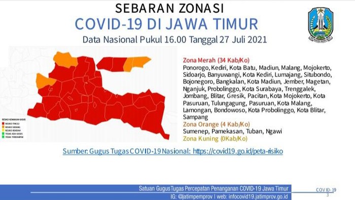 "Minggu ini 34 kabupaten kota masuk zona merah. Bertambah satu daerah, sebelumnya 33," ujar Jubir Satgas COVID-19 Jatim Dr Makhyan Jibril, Rabu (28/7/2021).