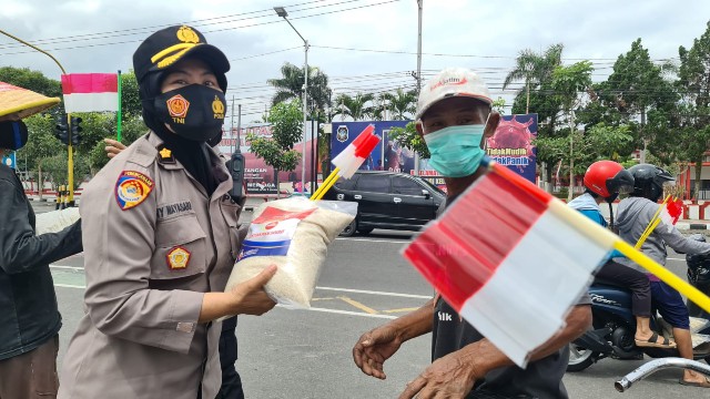 Tampak puluhan Polwan membagikan Bansos beras sebanyak 200 kantong Sak berisi @ 5 Kg beras yang bertemakan, " Kibarkan Merah Putih Lawan Covid-19, Indonesia Sehat Ekonomi Bangkit", kepada abang becak, pedagang keliling, juga awak (kernet) angkot yang melintas di setiap Jalan di tiga titik, termasuk masyarakat. Sebelumnya secara simbolis AKBP Yudhi Hery Setyawan menyerahkan bantuan dan Bendera Merah Putih para penerima dan lakukan foto bersama sambil lambaikan kibaran bendera Merah Putih.