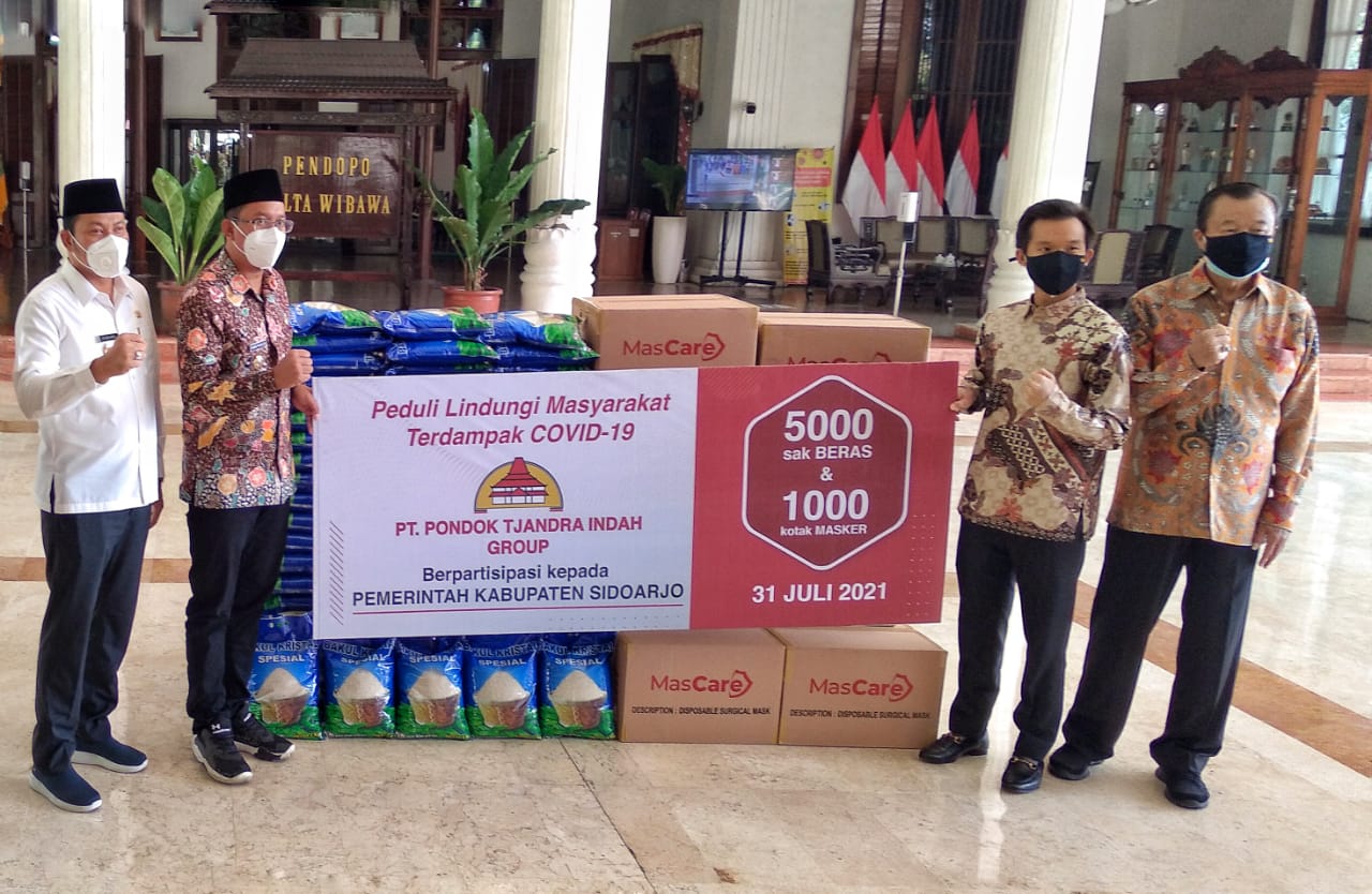 "Saat awal pandemi, April 2020 lalu kami telah berpartisipasi memberikan bantuan sembako beras masing-masing 5 kilogram sebanyak 8.000 sak. Sekarang kami kembali menyerahkan bantuan berupa sembako beras masing-masing 5 kilogram sebanyak 5.000 sak dan Masker sebanyak 1.000 kotak kepada pemkab Sidoarjo," ungkap Edward Sugiharto.