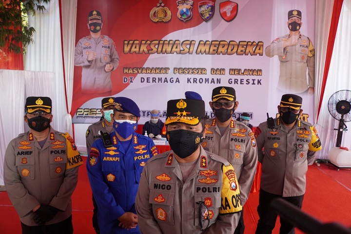 SURABAYAPAGI.COM, Gresik - Kapolda Jatim Irjen Pol Nico Afinta meninjau langsung pelaksanaan vaksinasi merdeka di Satpolairud Polres Gresik, Selasa (3/8/2021).