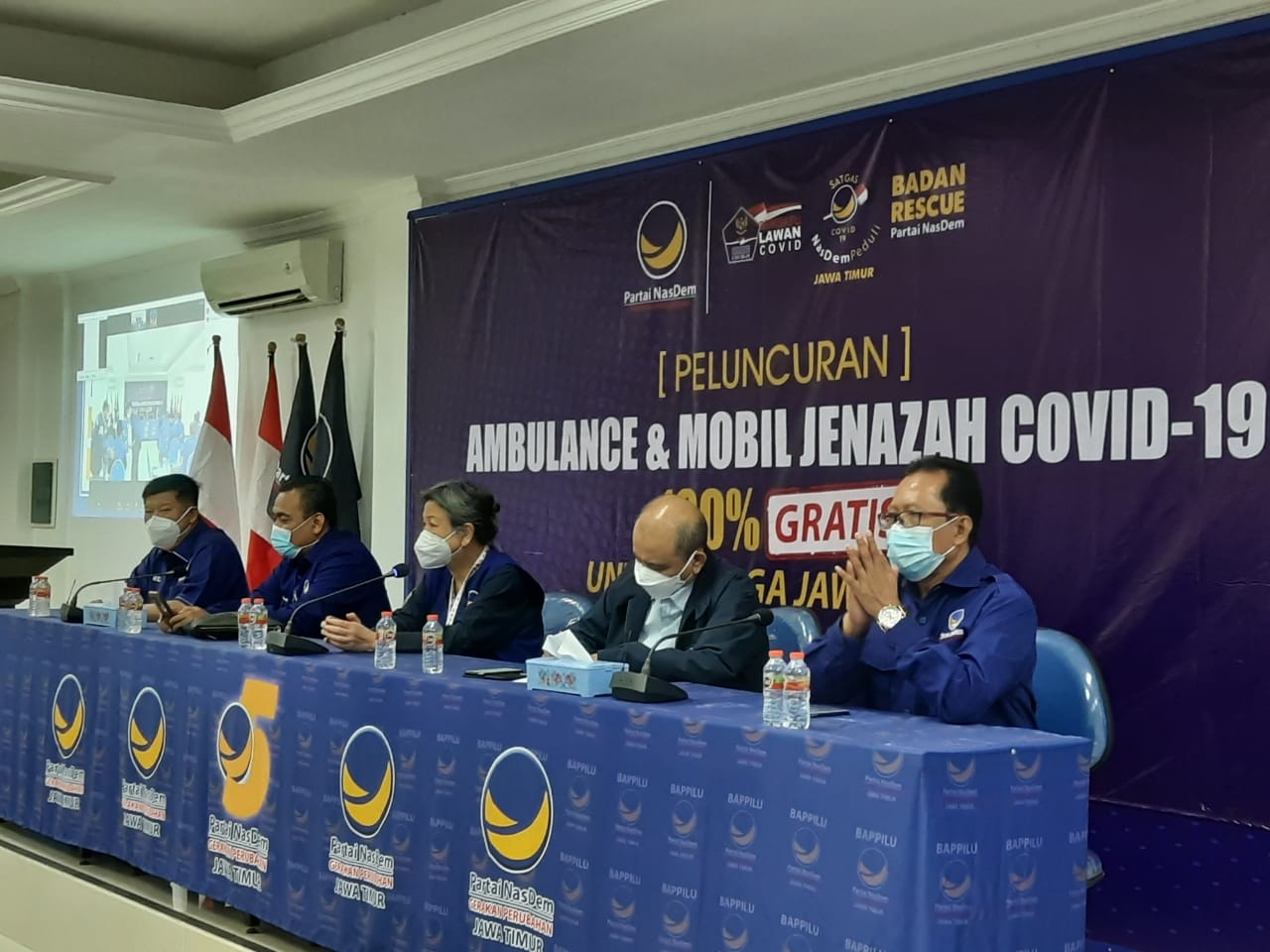 Ada lima mobil ambulans yang disediakan Partai Nasdem Jatim, diantaranya; tiga mobil ambulans untuk pasien Covid-19 yang ditempatkan di Kabupaten Sidoarjo, Bangkalan dan Gresik. Sementara dua mobil jenazah disiagakan di Kota Surabaya.
