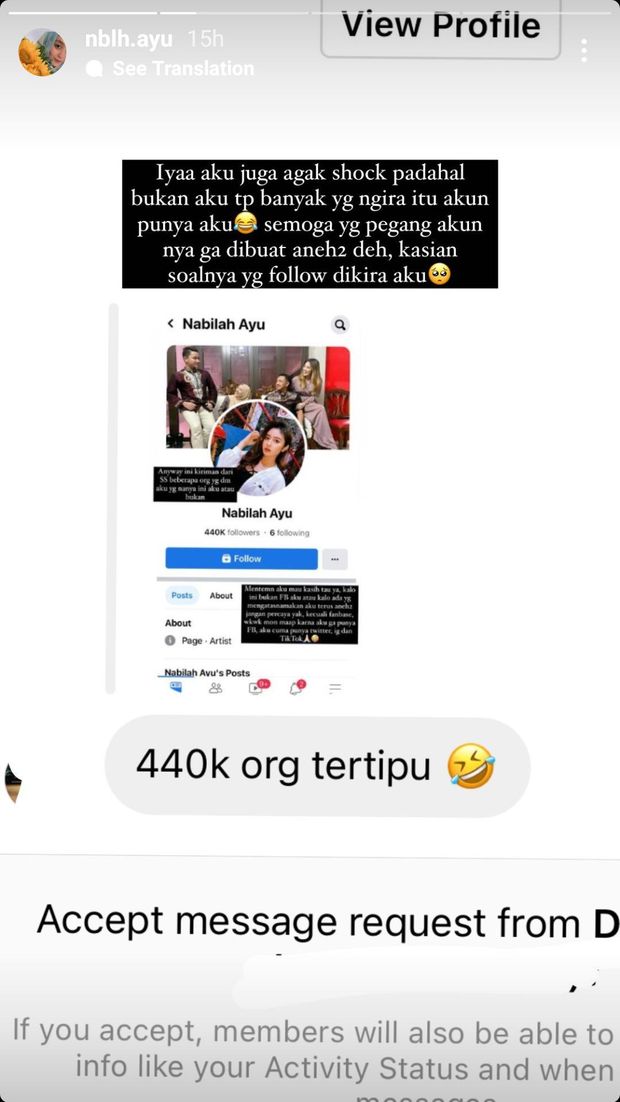 “Iyaa aku juga agak shock padahal bukan aku tapi banyak yang ngira itu akun punya aku (emoji tertawa),” ujar Nabilah Ayu, Rabu (11/8/2021).