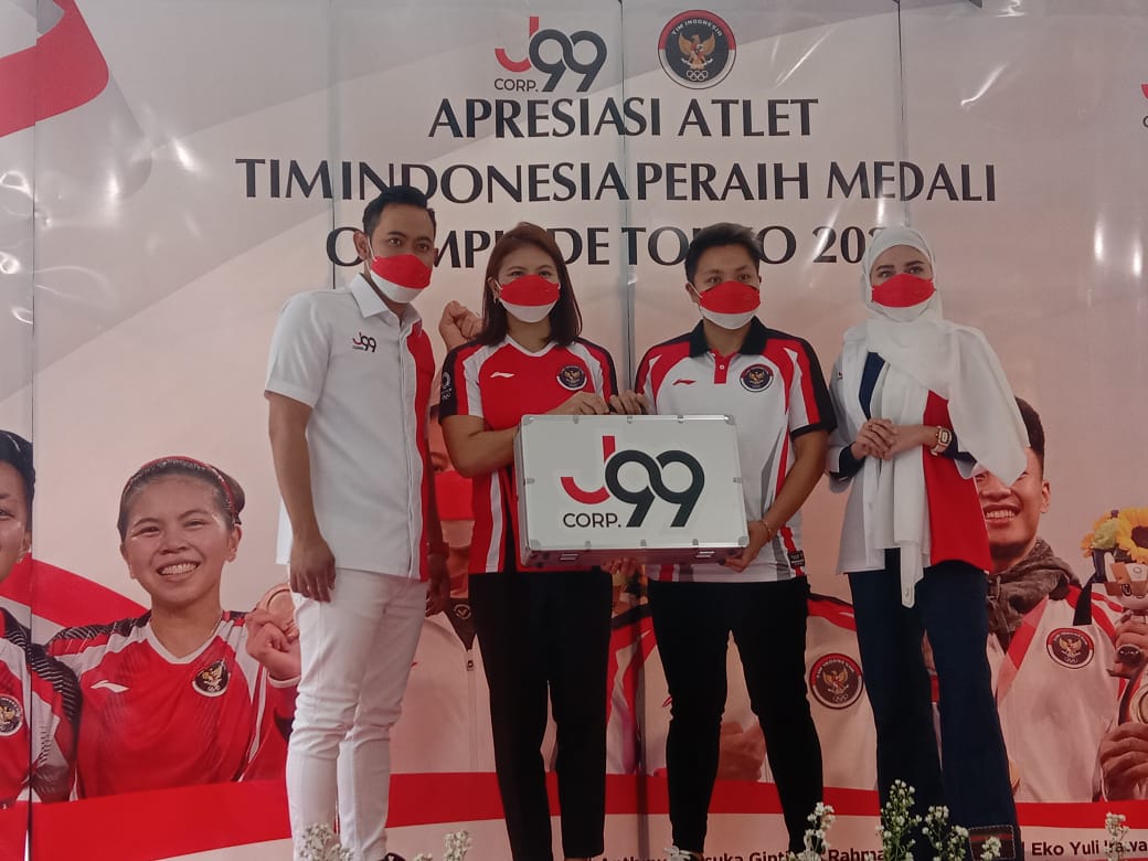 SurabayaPagi, Surabaya - Owner J99 Corp Gilang Widya Pramana memberikan bonus kepada atlet Indonesia yang berhasil meraih pundi - pundi medali saat gelaran Olimpiade Tokyo 2020.