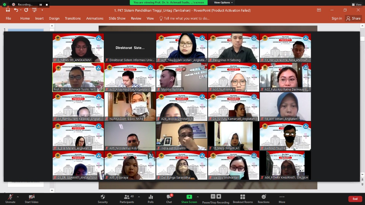 SurabayaPagi, Surabaya - Rektor Universitas 17 Agustus 1945 (Untag) Surabaya, Prof. Dr. Mulyanto Nugroho, MM., CMA., CPA., secara resmi membuka pelaksanaan Pelatihan Peningkatan Keterampilan Dasar Teknik Instruksional (Pekerti), Senin (23/8/2021).