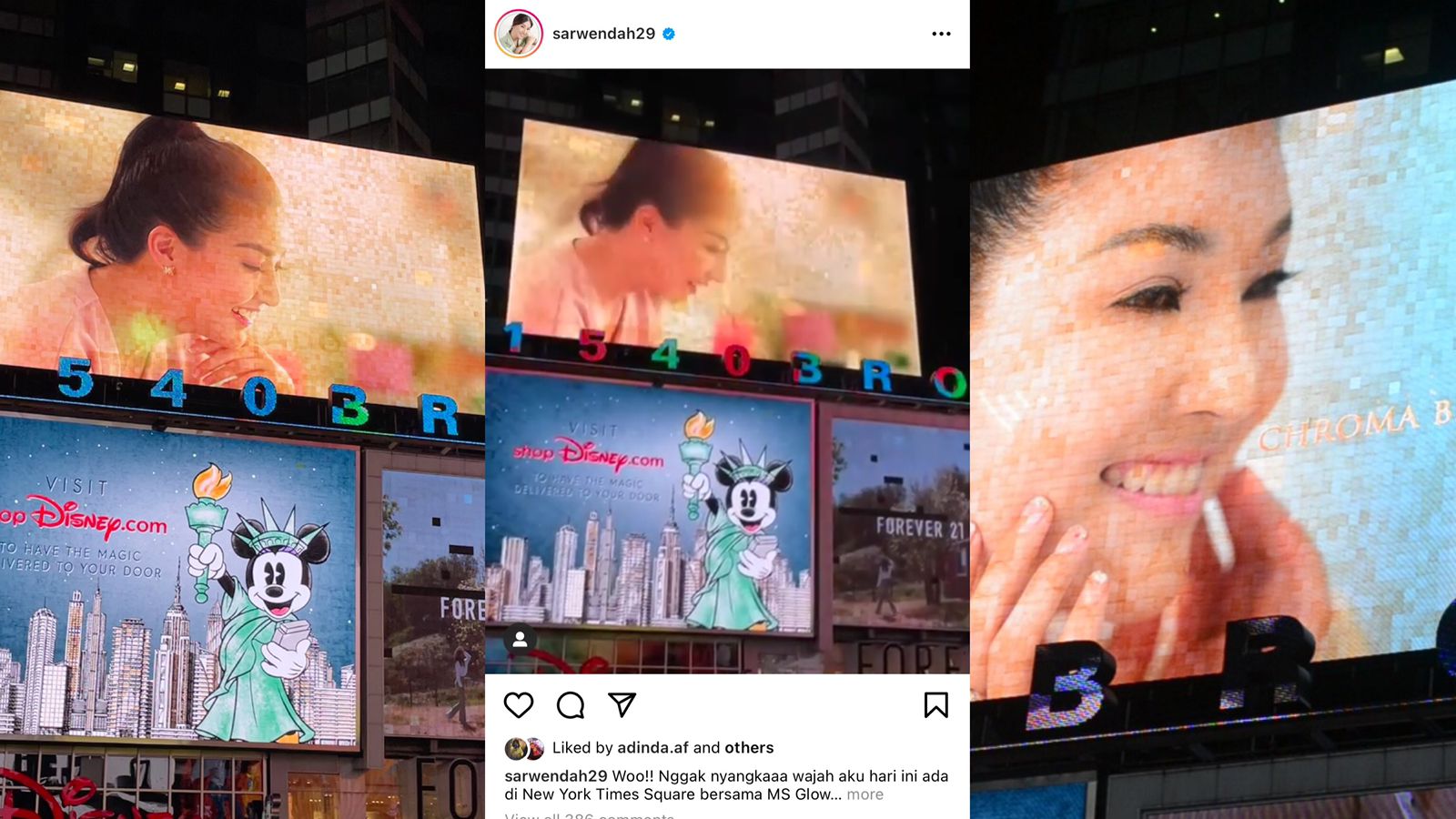 “Woo!! Nggak nyangkaaa wajah aku hari ini ada di New York Times Square bersama MS Glow!! Banyak diimpi-impikan semua orang dan sekarang aku mendapatkan kesempatan itu, ujar Sarwendah.