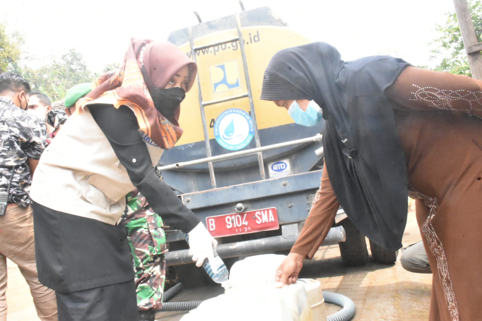 SURABAYA PAGI.COM, Mojokerto - Bupati Mojokerto Ikfina Fahmawati didampingi Kepala Pelaksana Badan Penanggulangan Bencana Daerah (BPBD) Ludfi Ariyono, membagikan langsung distribusi air bersih bagi warga di tiga RT Dusun Kandangan Desa Kunjorowesi Kecamatan Ngoro, Sabtu (4/9) pagi.