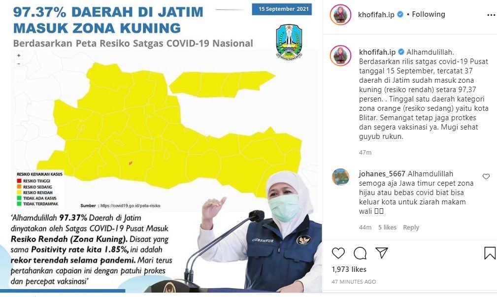 "Alhamdulillah, berdasarkan rilis Satgas COVID-19 pusat tanggal 15 September, tercatat 37 daerah di Jatim masuk zona kuning (risiko rendah), setara 97,37 persen," tulis Khofifah.