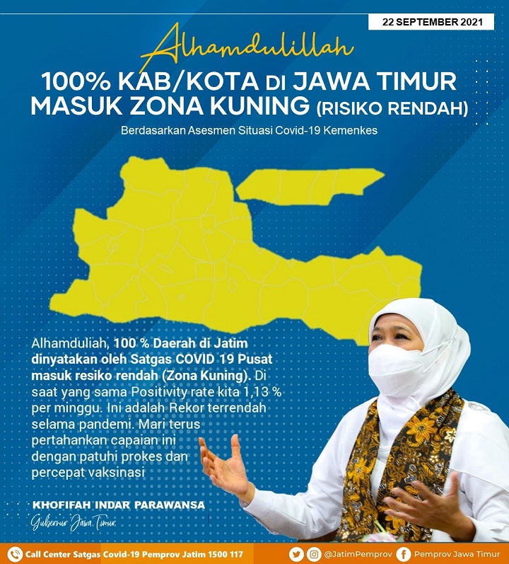 Kali ini, berdasarkan data dari Satgas Covid-19 Nasional per 22 September 2021, sebanyak 38 kabupaten/kota di Jawa Timur semuanya masuk zona kuning atau resiko rendah penyebarannya. Artinya, saat ini daerah dengan zona kuning di Jatim sudah mencapai 100%.