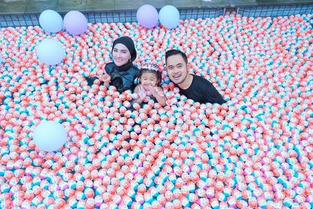 Jajanan coklat yang akrab dengan anak-anak tersebut dijadikan sebagai lautan Kinder Joy untuk berenang para tamu undangan.