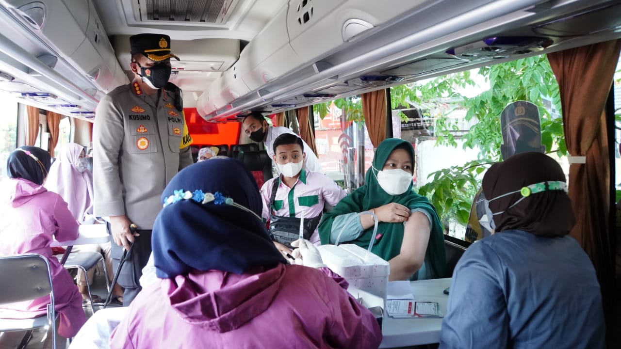 SURABAYAPAGI, Sidoarjo - Mencegah penyebaran Covid-19 di kawasan pasar, kembali Polresta Sidoarjo membawa bus Gerai Vaksin Mobile di Pasar Larangan, Candi, Sidoarjo, Senin (27/9/2021).