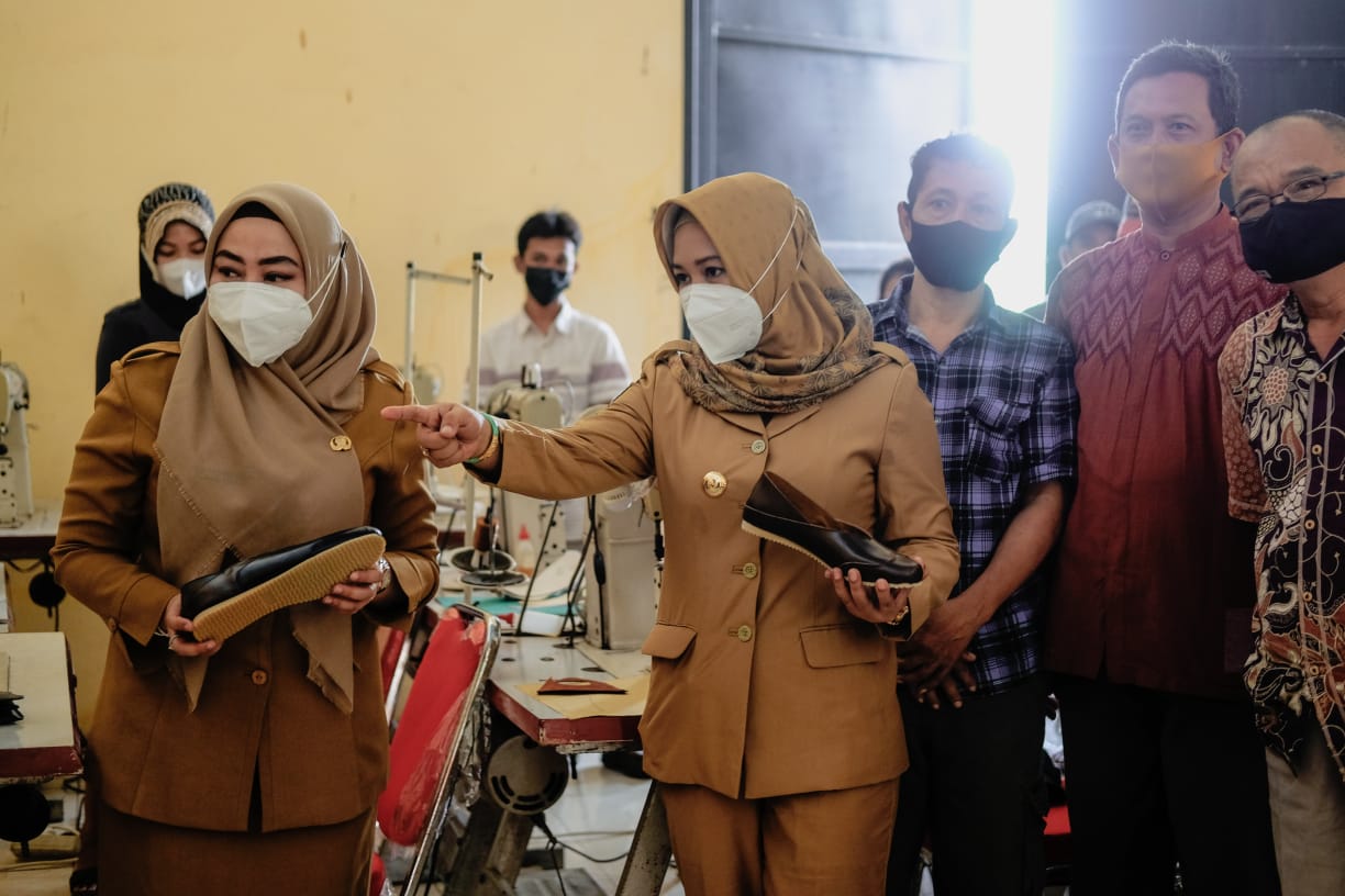 SURABAYA PAGI.COM, Mojokerto - Wali Kota Mojokerto, Ika Puspitasari meninjau inkubasi Wirausaha Sepatu di Gedung Workshop Alas Kaki Kota Mojokerto, Jalan Surodinawan, Senin (4/10/2021).