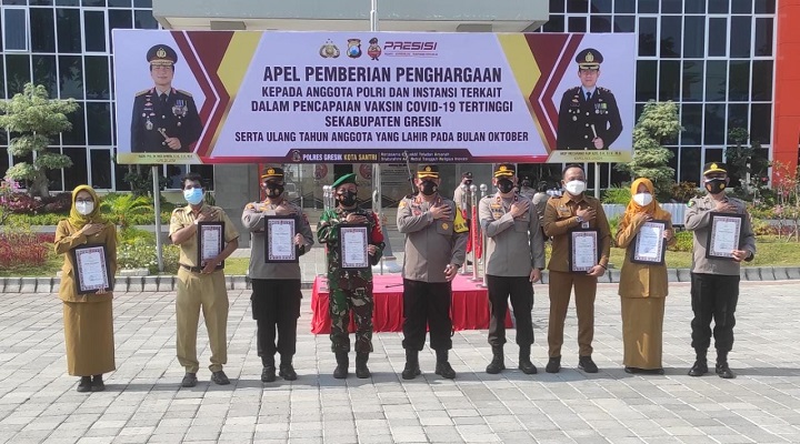SURABAYAPAGI.COM, Gresik - Capaian vaksinasi yang ditorehkan Satgas Covid-19 wilayah Gresik Kota mendapat penghargaan dari Kapolres Gresik AKBP Mochamad Nur Azis, Senin (4/10/2021). Tujuannya mendorong percepatan vaksinasi dalam rangka mencapai target herd immunity.