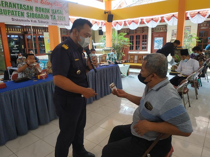 SURABAYAPAGI, Sidoarjo - Dalam rangka menekan peredaran rokok ilegal, Dinas Kominfo Pemkab Sidoarjo terus menggalakkan gempur rokok ilegal melalui kegiatan sosialisasi pemberantasan rokok ilegal pada masyarakat. Kali ini kegiatan sosialisasi dilaksanakan di Balai Desa Banjarbendo Kec Sidoarjo, Selasa (5/10/2021) yang diikuti puluhan warga.