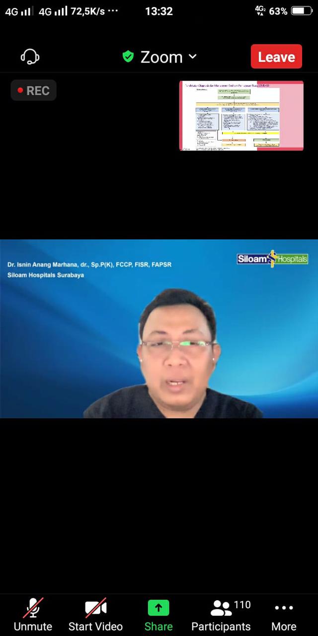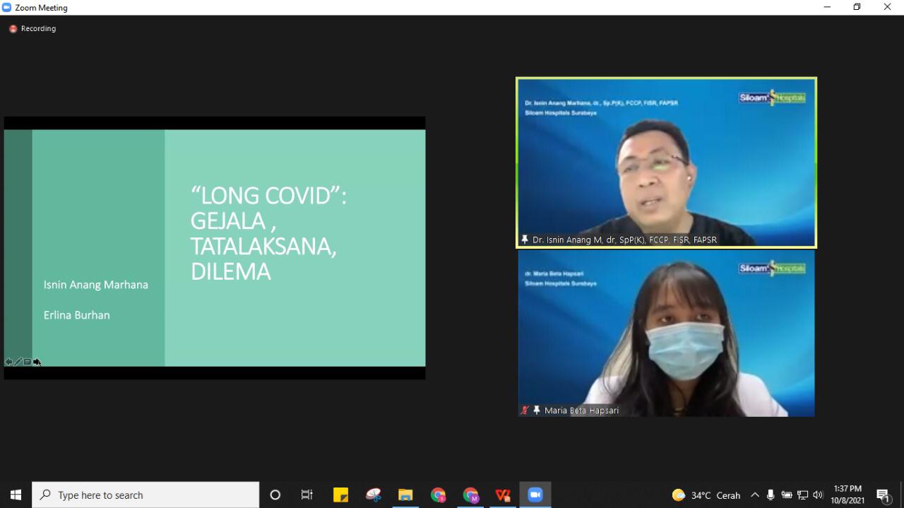 "Paska infeksi akut dari virus COVID-19, terjadi kerusakan endotel dan inflamasi pada jaringan paru. Umumnya terjadi pada latihan dan riwayat memori traumatis akan penyakit yang berat juga perawatan yang lama di rumah sakit", tutur dokter DR. Isnin Anang membuka edukasinya yang bertajuk "Kenali long COVID-19 dan penanganannya" melalui aplikasi Zoom, Jum'at (08/10/2021) di kota Surabaya.