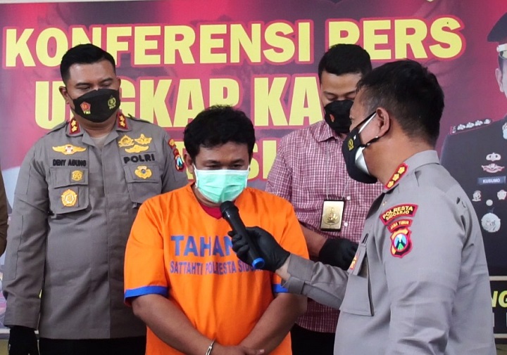 Kapolresta Sidoarjo Kombes Pol. Kusumo Wahyu Bintoro, memberikan keterangan pada wartawan, Kamis (14/10/2021), jika tim saber pungli Satreskrim Polresta Sidoarjo berhasil melakukan OTT terhadap Kepala Desa Klantingsari, WS, di rumahnya.